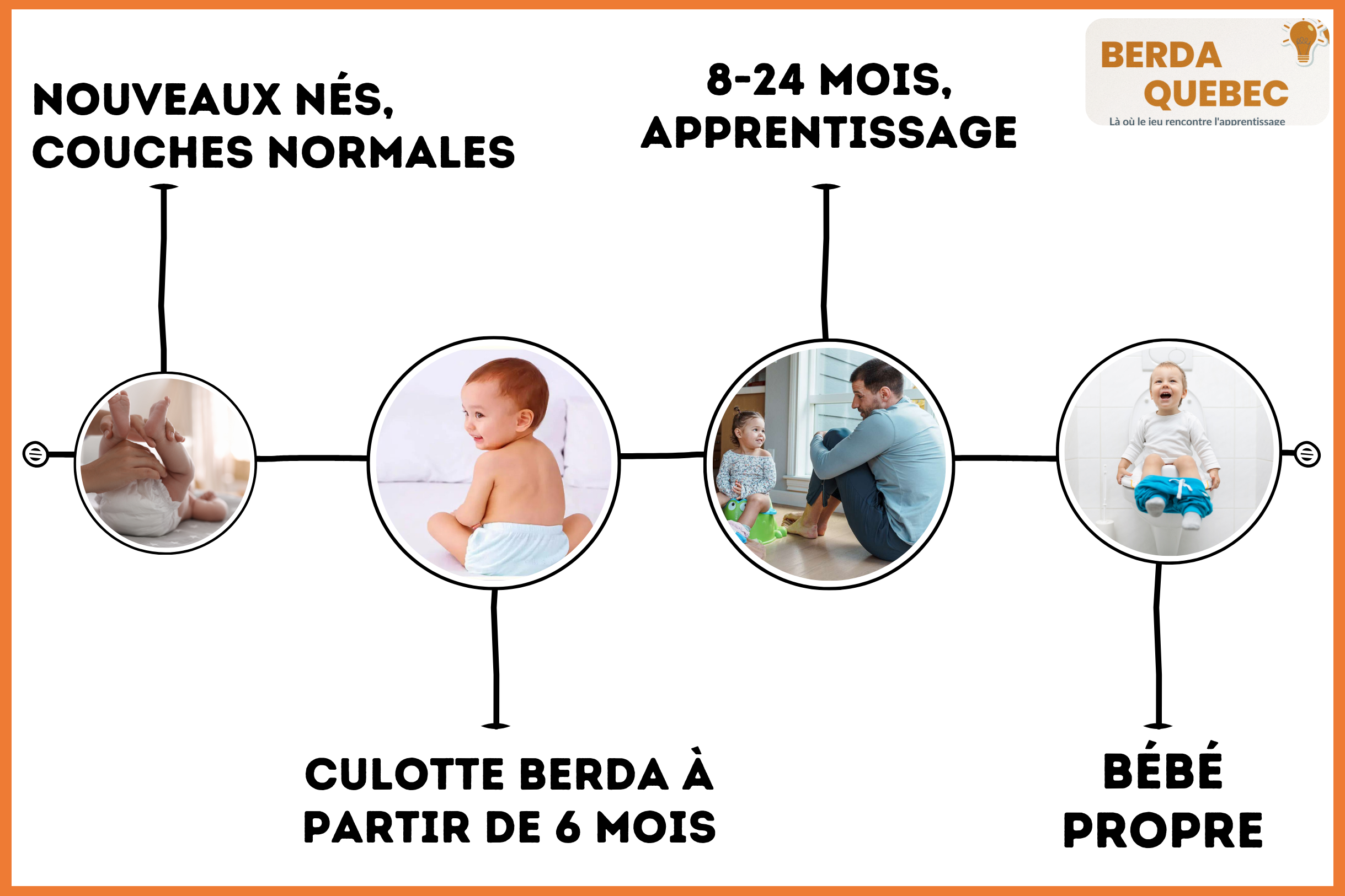 Cette ligne de temps explique comment nos culottes d'entrainement accelèrent le processus d'apprentissage de votre enfant pour qu'il soit propre rapidement.