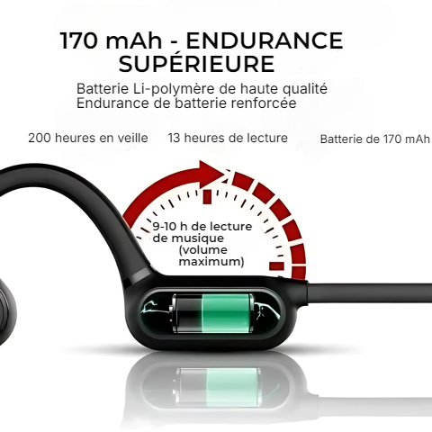Profitez maintenant d'heures de musique sans endommager vos oreilles. Elle utilise la technologie de conduction osseuse qui crée des vibrations pour transmettre le son à travers les os de votre visage (mâchoires et pommettes) directement à l'oreille interne.