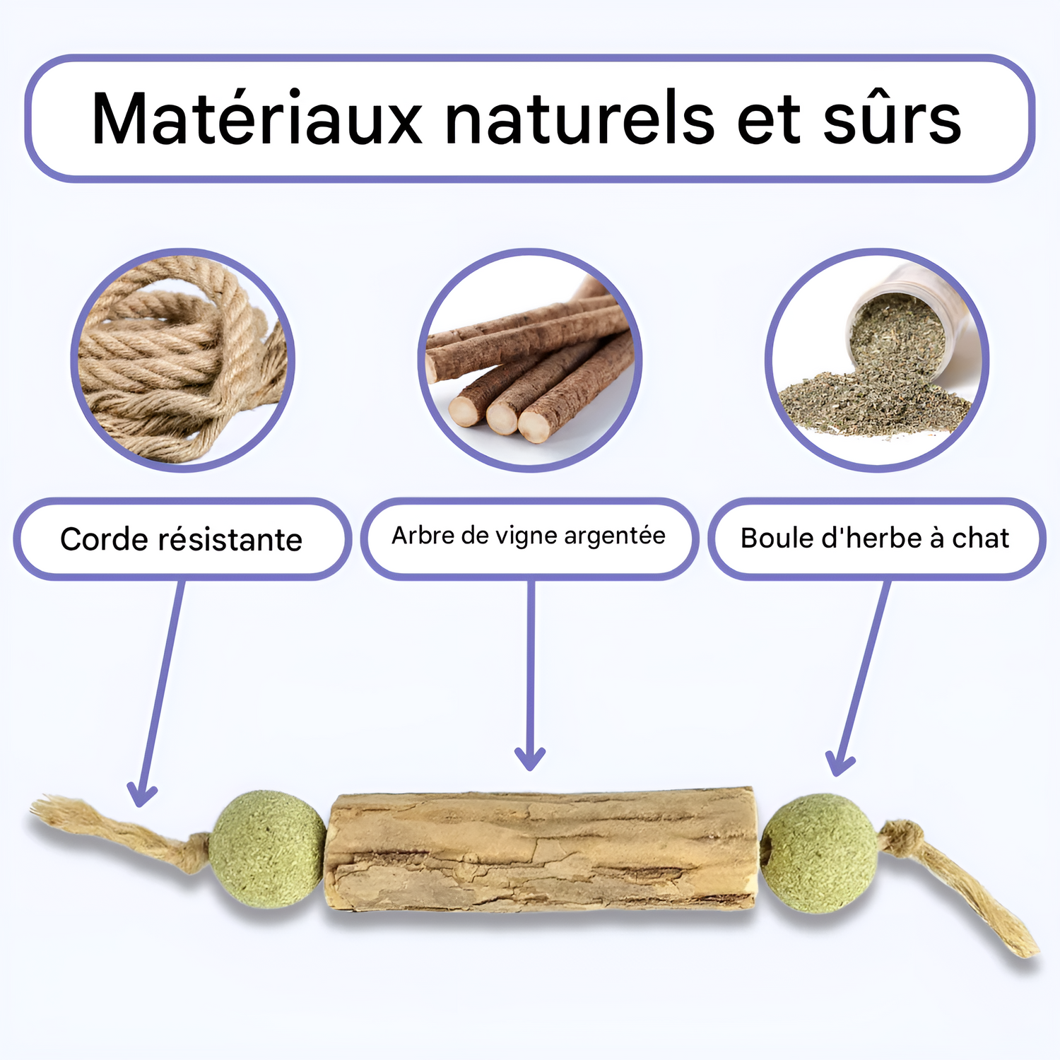 Griffinet™ est fait de matériaux naturels que les chats adorent. Le jouet est conçu en bois de silvervine, une plante au parfum irrésistible pour les chats. À chaque extrémité se trouve une boule de cataire (herbe à chat) de qualité supérieure, qui stimule l’envie de jouer et de mordre.