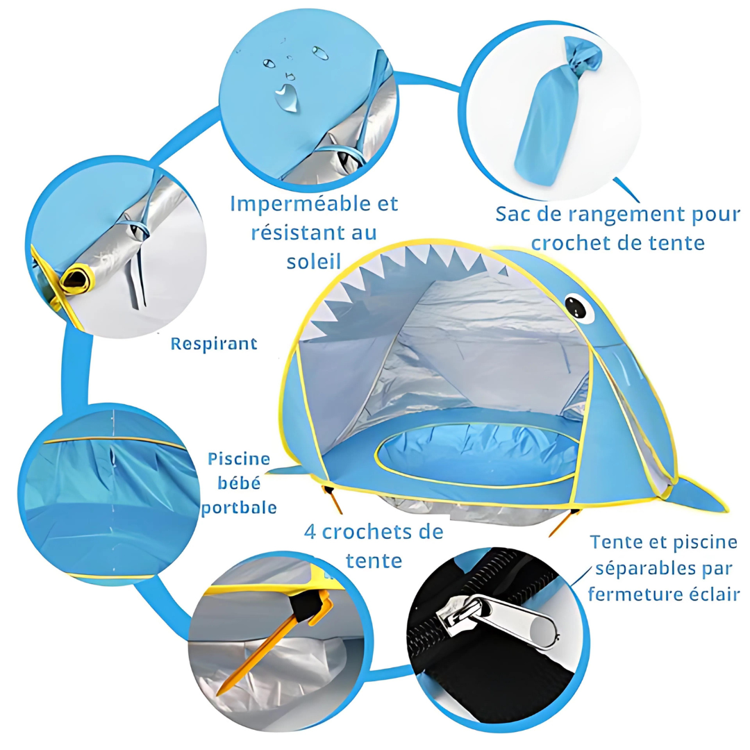 Découvrez la SHARKY™, où le design ludique rencontre le confort pratique. Notre tente pour enfants est conçue pour offrir une petite piscine intégrée pour des heures de jeu aquatique. C'est la solution parfaite pour les parents qui veulent allier sécurité et amusement pour leurs enfants, que ce soit à la plage, dans le jardin ou en pique-nique.