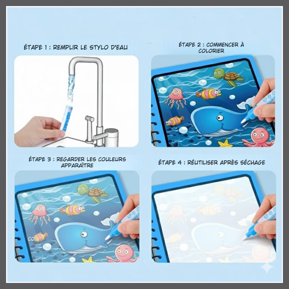 Chaque page reprend vie à chaque goutte d’eau. Votre enfant redécouvre ses dessins encore et encore, développant sa motricité et sa créativité sans gaspillage ni stress. Une expérience sensorielle douce et apaisante.